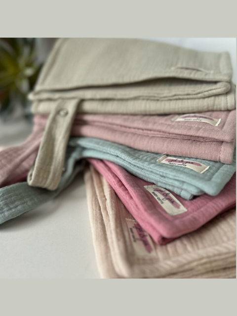 This 100% Cotton Muslin burp cloth features an absorbent inner and a handy dummy clip attachment, keeping the dummy close. It also doubles as a soft security blanket, making it both practical and comforting for little ones. Available in a variety of beautiful colours depending on stock availability. Irene can also make personalised things, so pop us an email, we'd love to hear from you. Handmade with love by Irene of JD & Jaz.