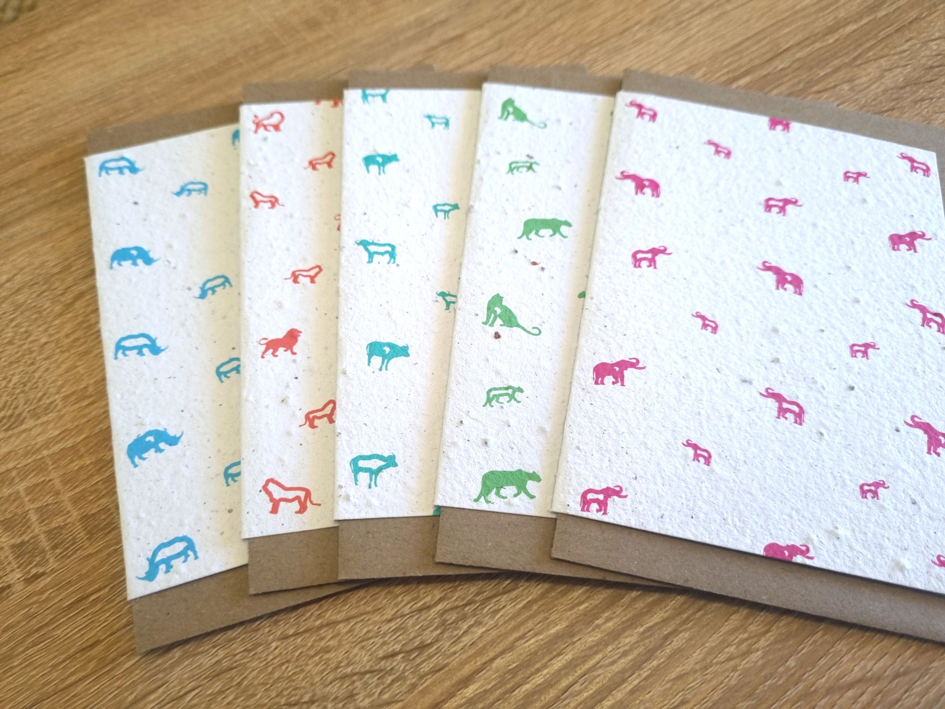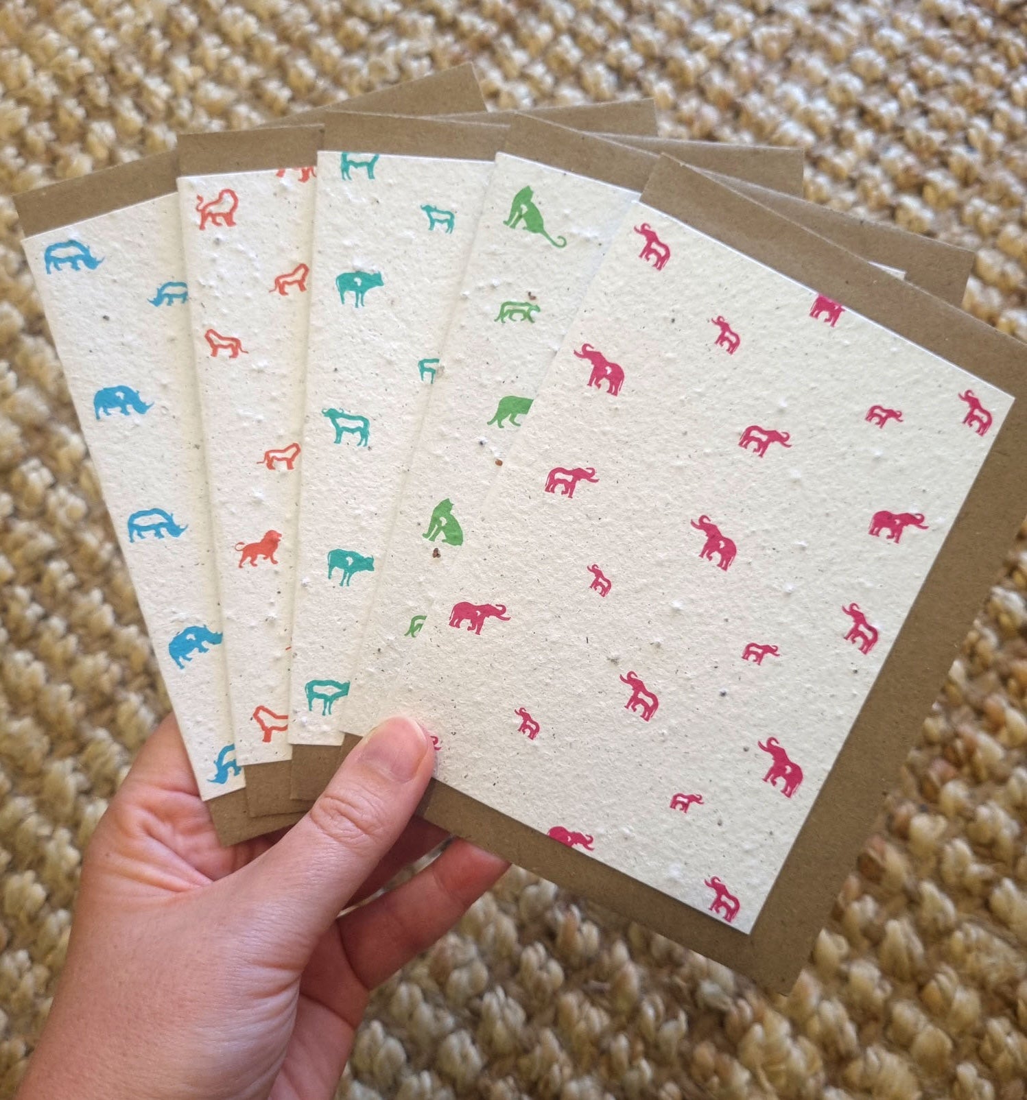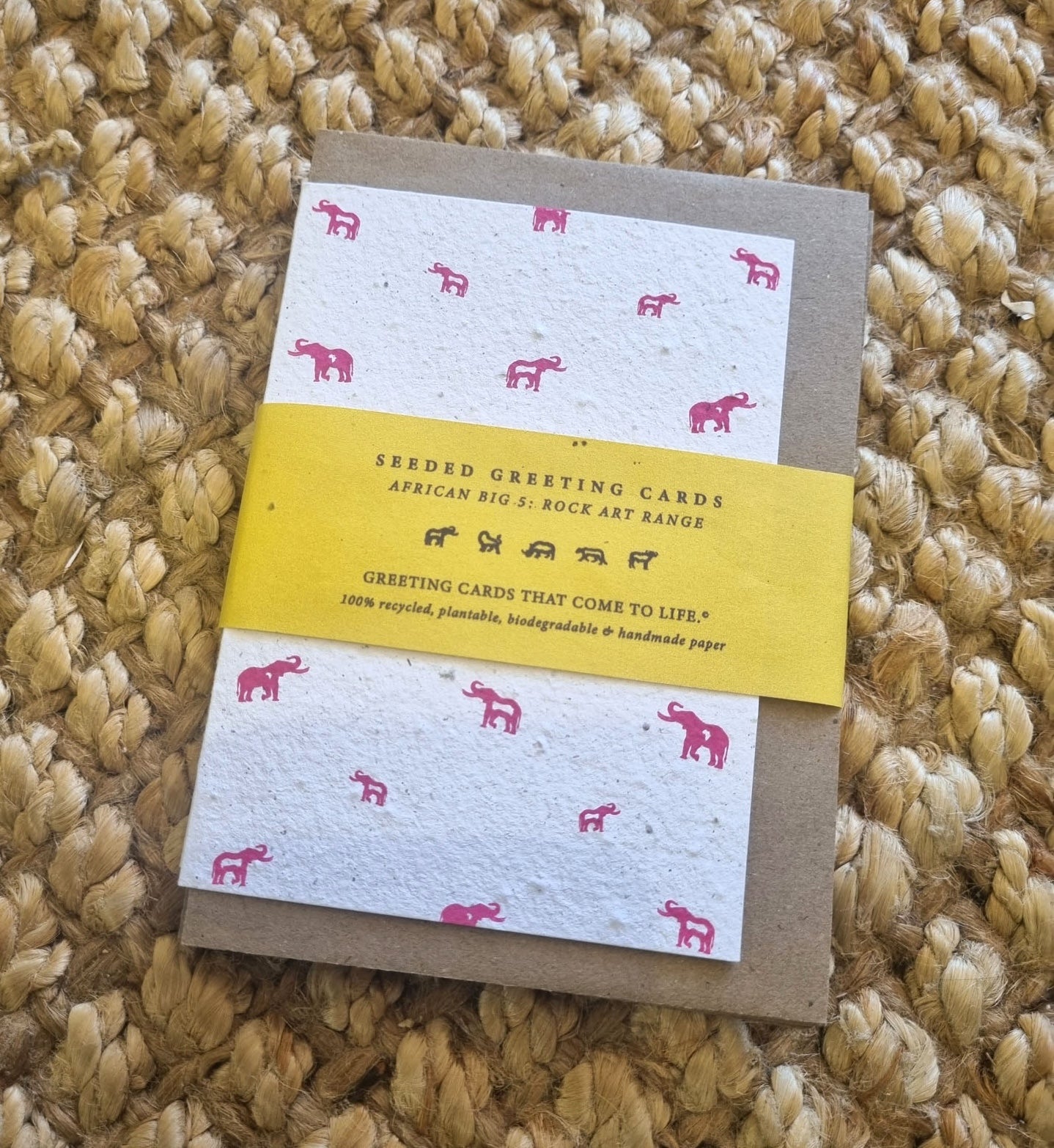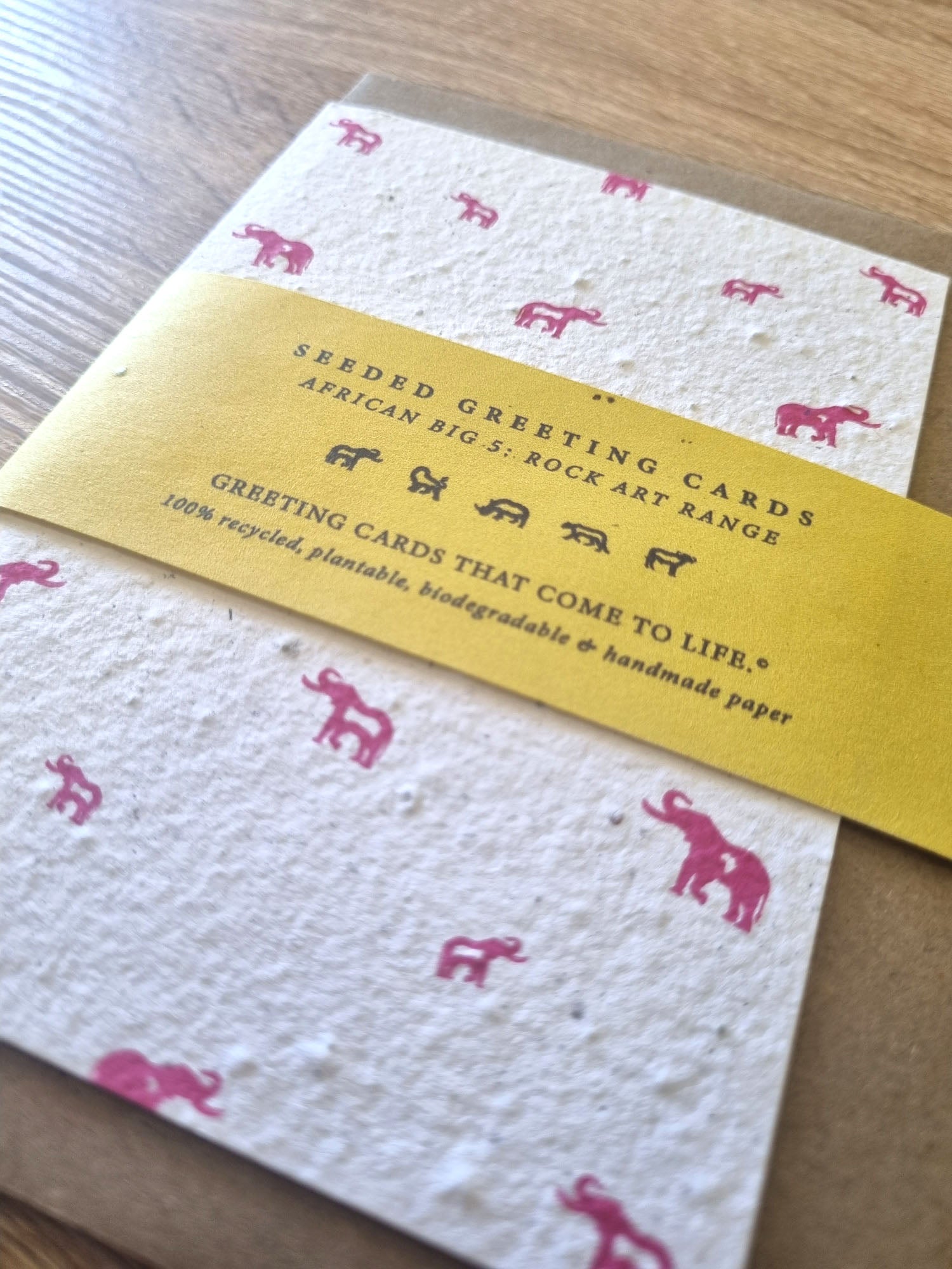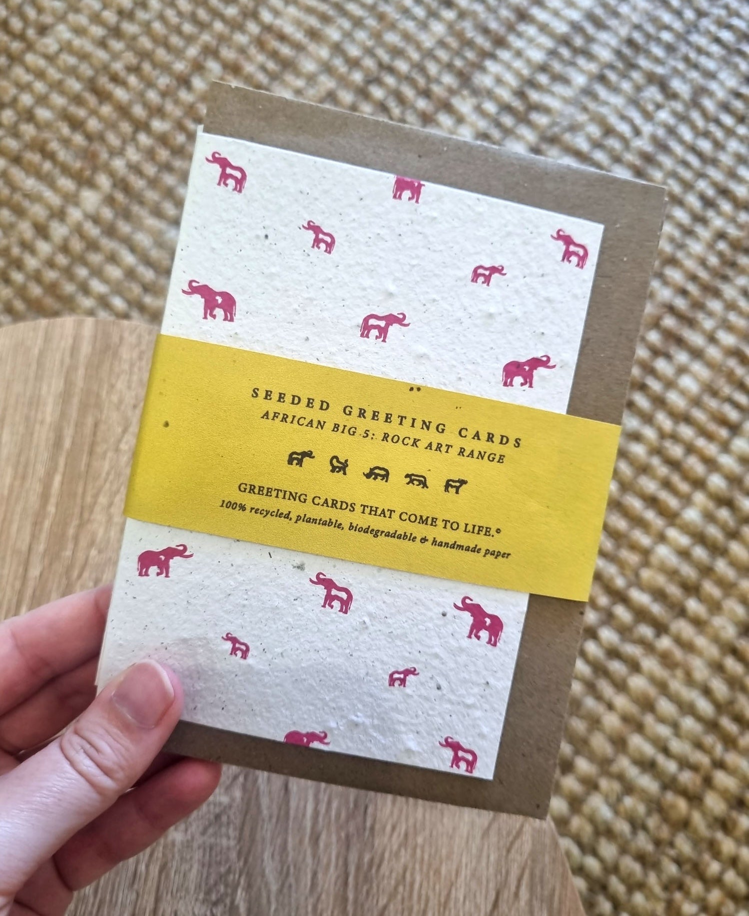 These Rise + Revive greeting cards started when Nicole Wood, a graphic designer from a small town in Mpumalanga, wanted to create art that matters; designing something that was ethical, and sustainable and that represented her roots in Africa. She’s always had a love for how greeting cards could be used to encourage, uplift and inspire others. The combination of this thought, and the idea of creating something that was eco-friendly, is where Rise + Revive’s seeded, recycled, greeting cards were born; Greeting cards that come to life… your words come to life! With the love for design and communication came the idea to create the cards with a visual inspiration from rock art; the origin of visual design & communication. This ties in to the love of Africa; the natural raw beauty that the cards texture brings out, as well as the bright colour prints that speak to the vibrancy and beauty of the people and cultures of Africa. The design of the Big 5 on the cards is to tie more deeply to Africa and the nature that abounds.
