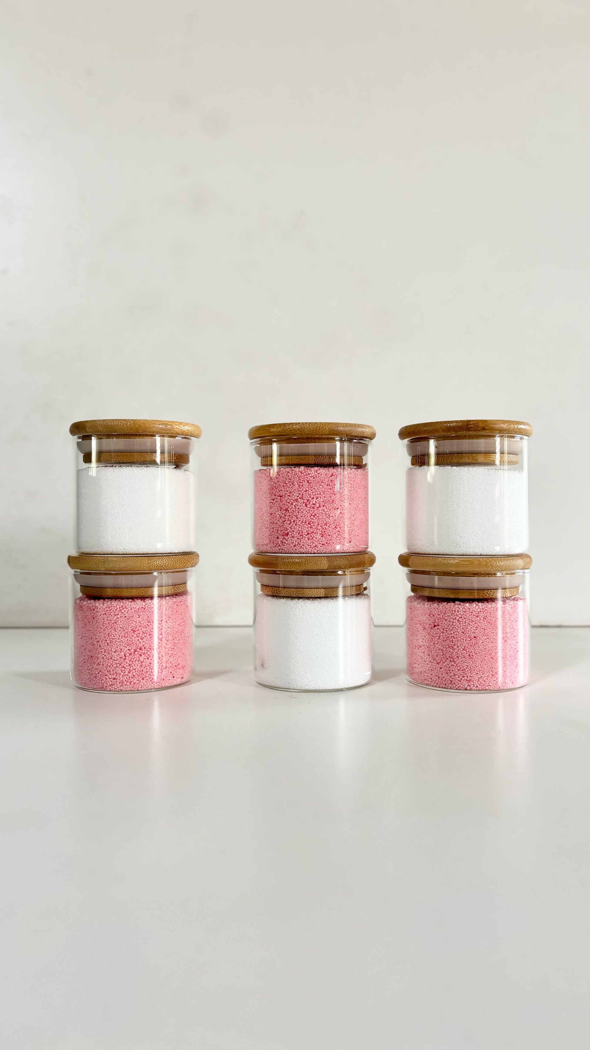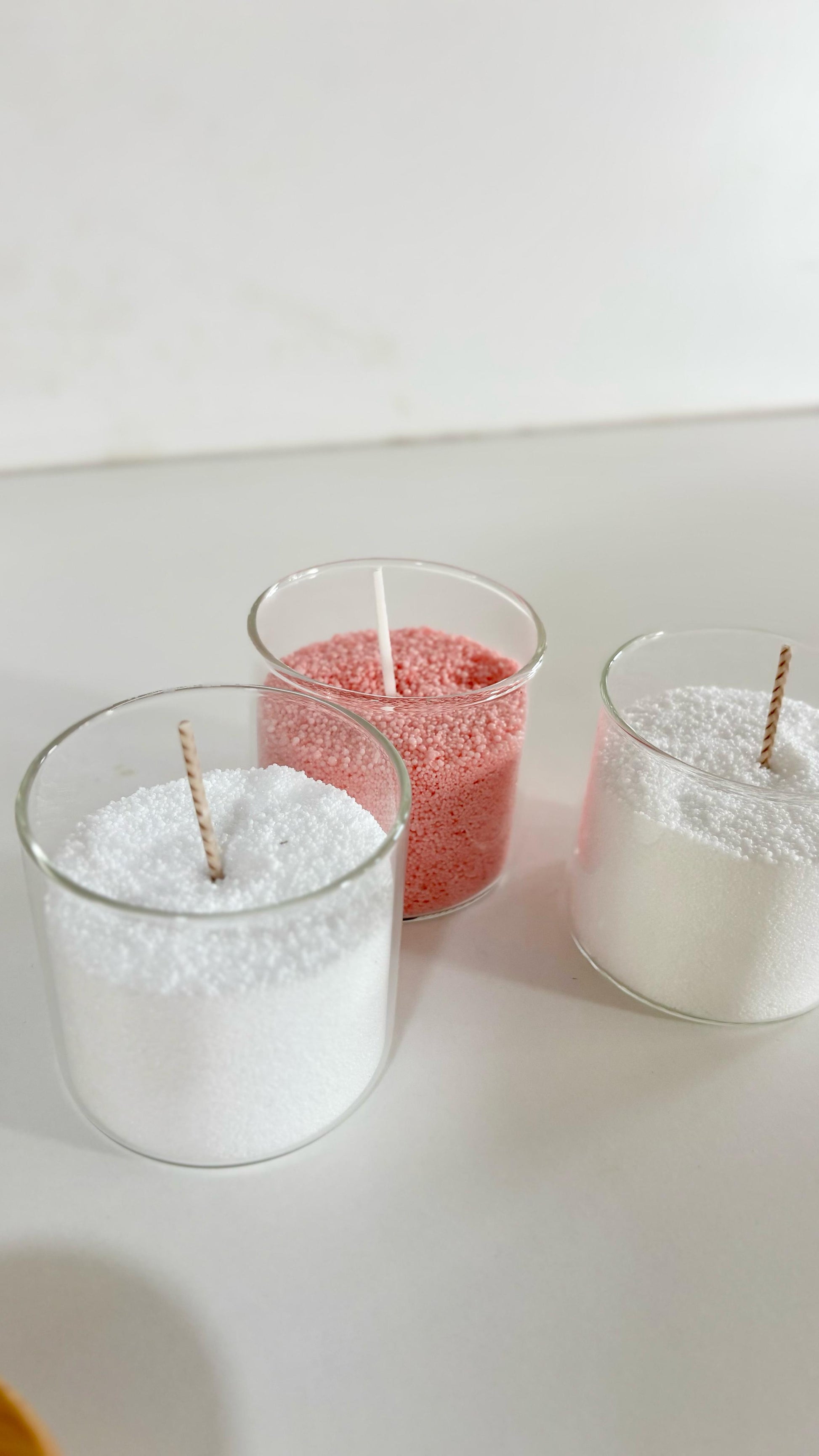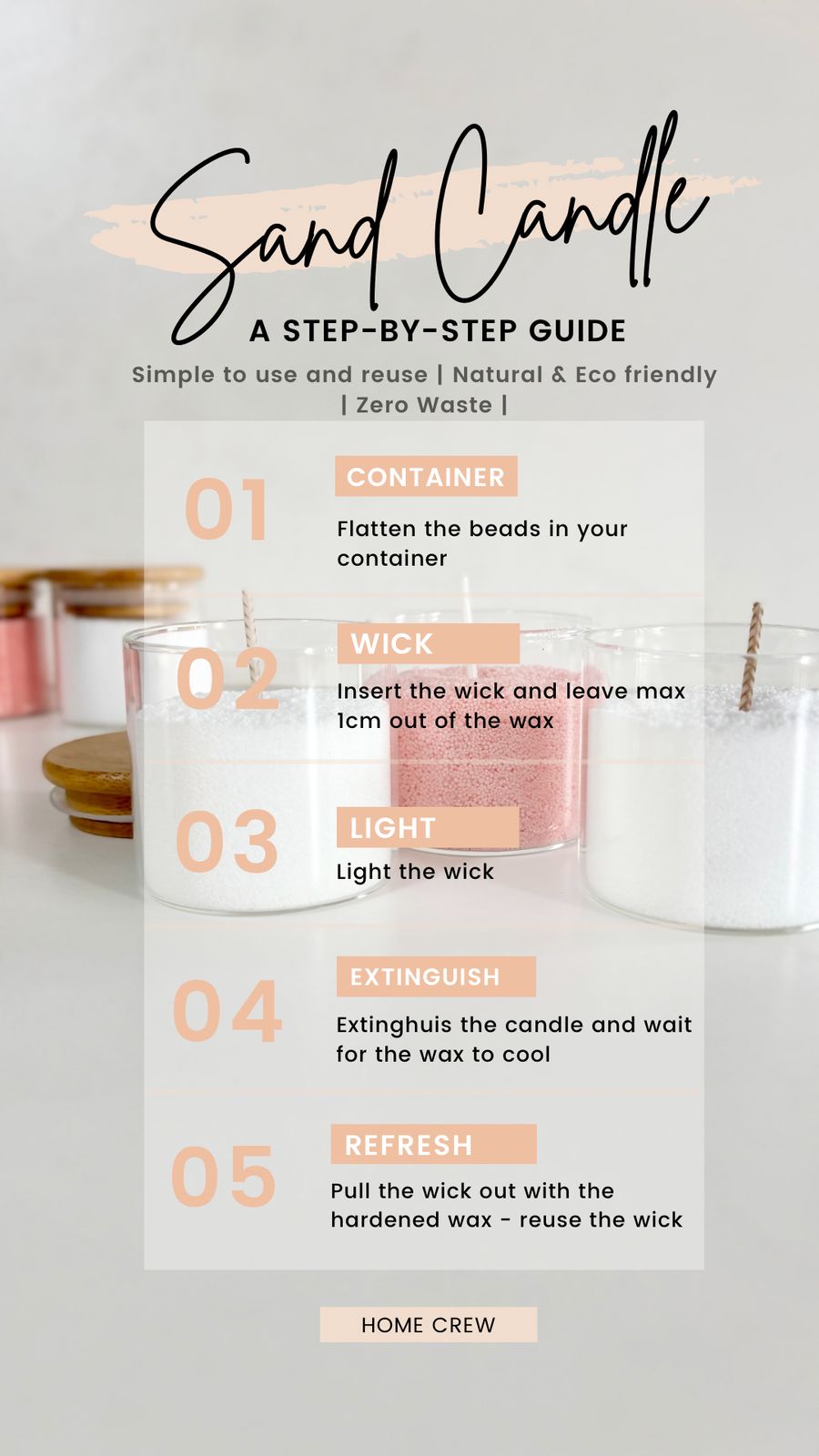Simply flatten the sand beads in your container, insert the wick and leave max 1cm out of the wax, light the wick and enjoy. Remember to extinguish the candle and wait for the wax to cool. To refresh: pull the wick out of the hardened wax and reuse.