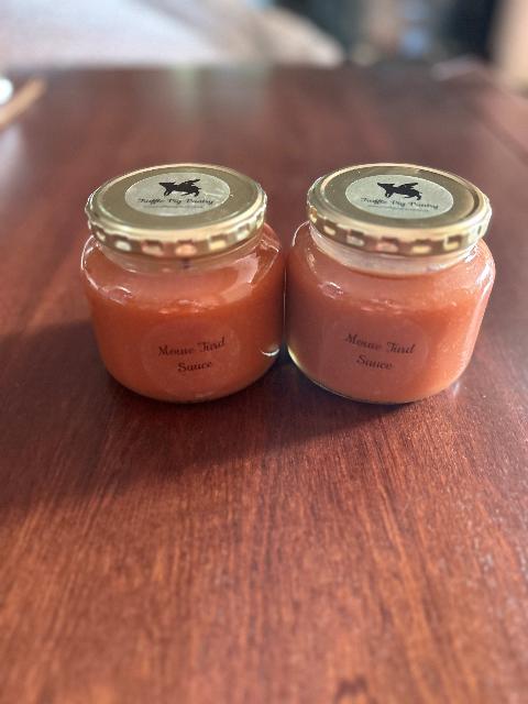 Made using sugar, vinegar, egg, fruit jelly, flour and mustard powder.